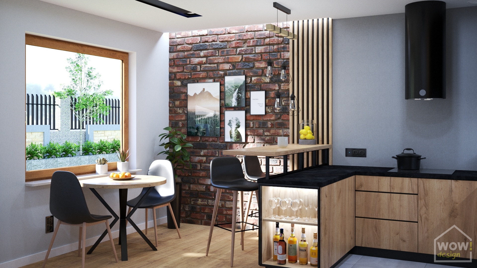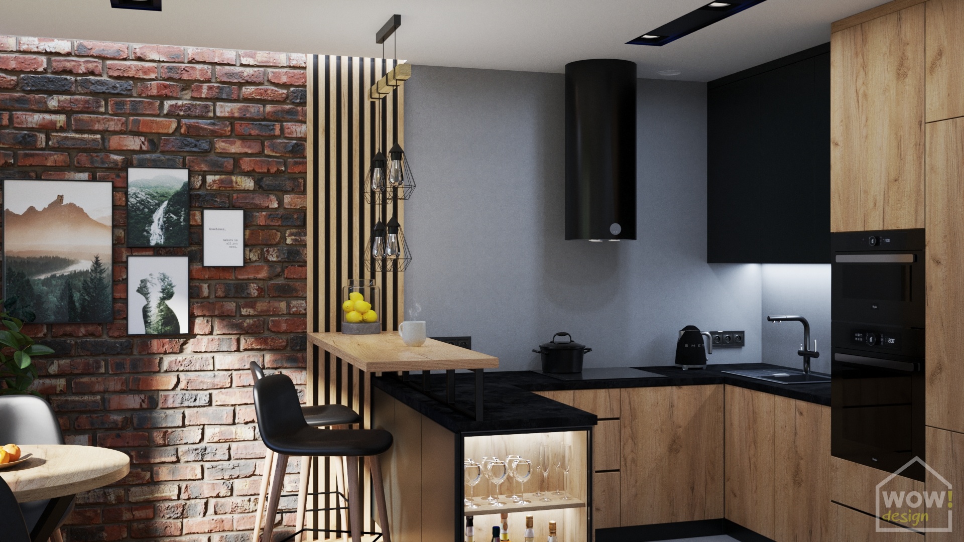 Pomieszczenie zostało podzielone na dwie strefy- przygotowywania potraw i ich spożywania. Na podłodze wykorzystaliśmy płytki w kolorze szarym, które idealnie łączą się z kolorami paneli i mikrocementu na ścianie. Całość została ocieplona lamelami oraz meblami z frontami w kolorze Dąb Craft Złoty, który szczególnie wpadł w oko inwestorce. Nie można też przejść obojętnie obok ściany z lica cegły nadającej kuchni industrialnego charakteru.