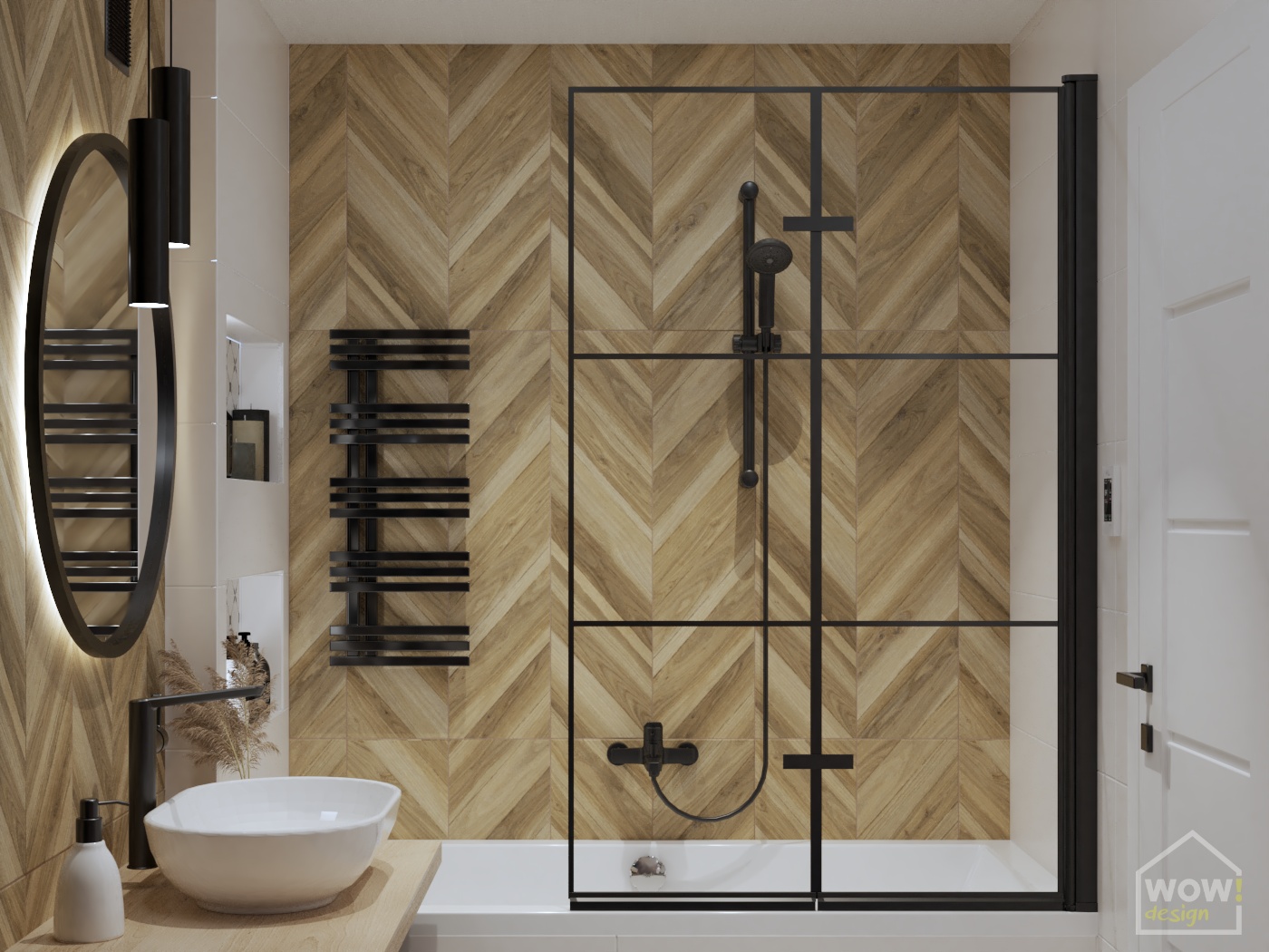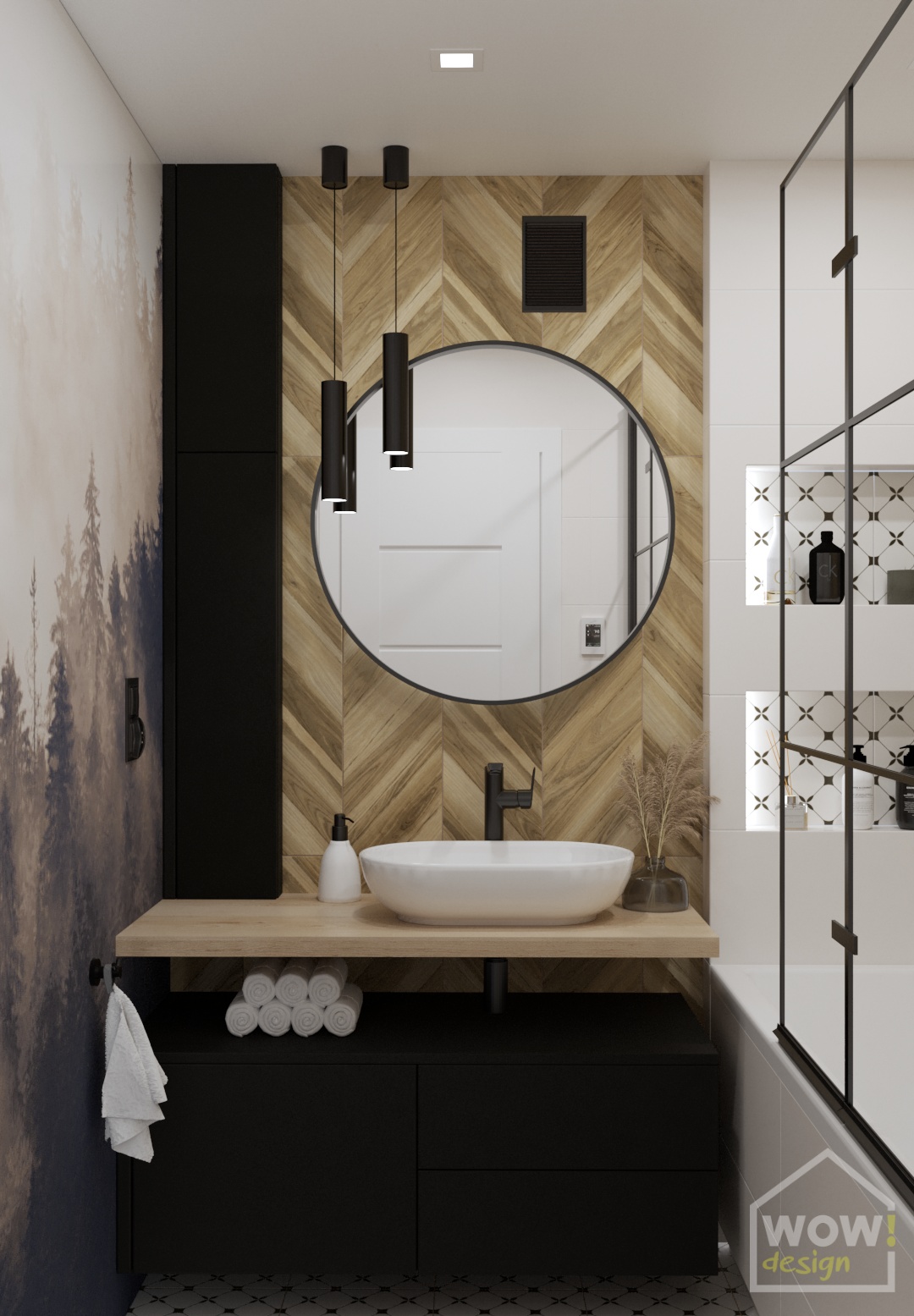 Łazienka, w której znajduje się klimatyczna ściana z lasem oświetlona led'ami wprowadza w idealny stan relaksu po ciężkim dniu. Płytki z imitacją jodełki współgrają z tapetą i pozostałymi elementami wyposażenia w łazience, jak i całym mieszkaniu. Dzięki dobrze doświetlonej strefie przy lustrze, płeć piękna nie będzie miała problemu z porannym makijażem.