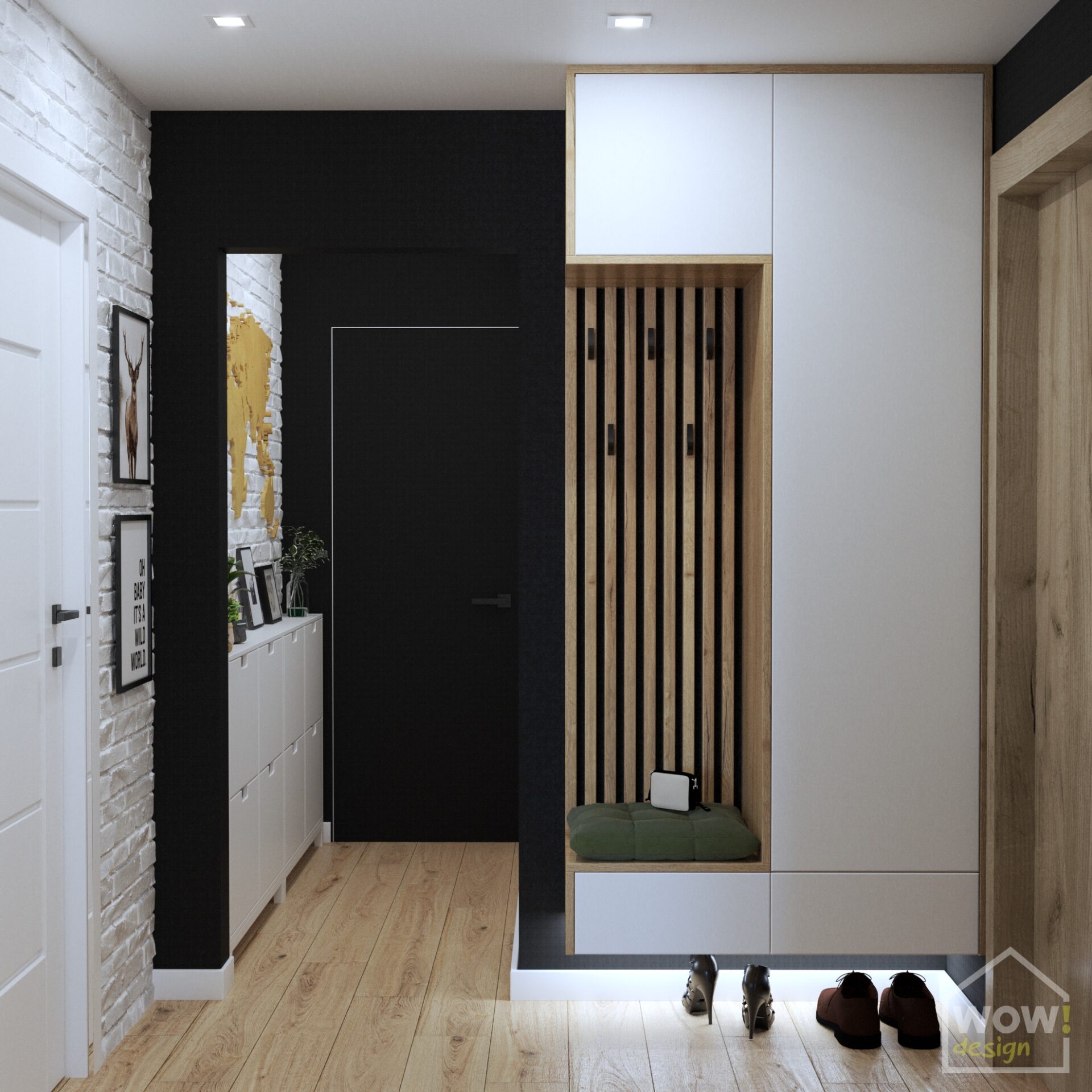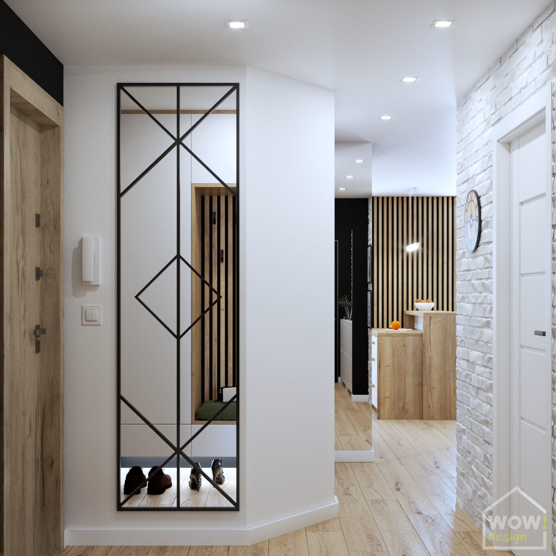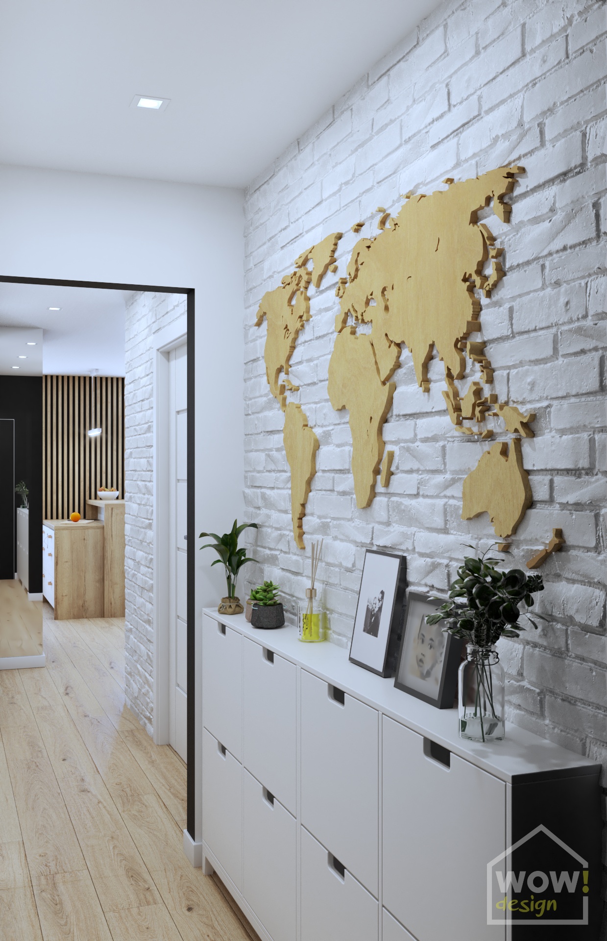 Hol, w którym znajdują się ściany z cegłą wprowadza w styl skandynawski królujący w pozostałych pomieszczeniach w mieszkaniu w Kielcach. Mimo małej przestrzeni udało się wygospodarować miejsce na zabudowę do przechowywania kurtek czy butów. W drugiej części holu pierwsze skrzypce gra drewniana mapa 3d, która nie tylko nadaje charakteru, ale i świetnie ociepla jasne ściany.