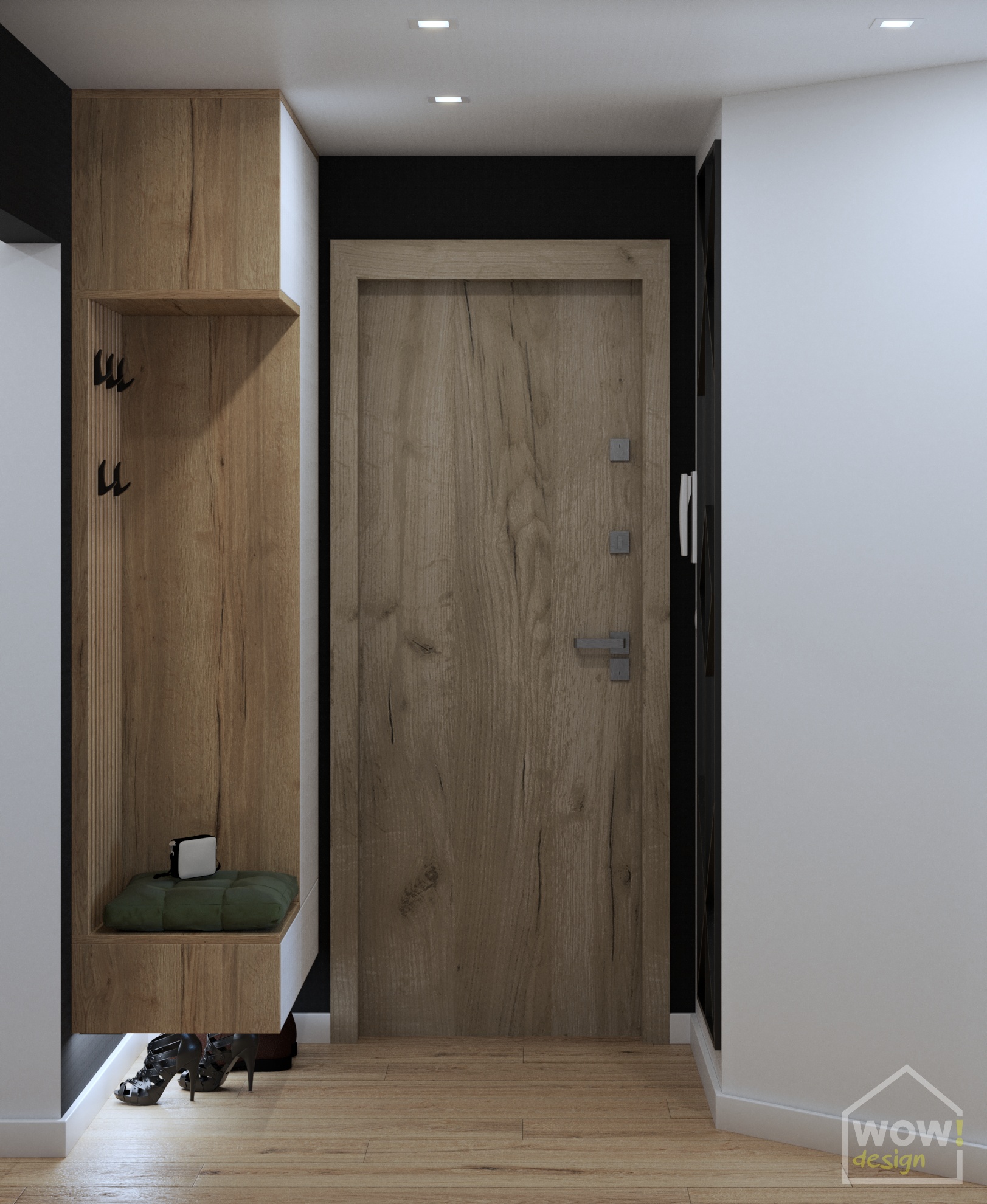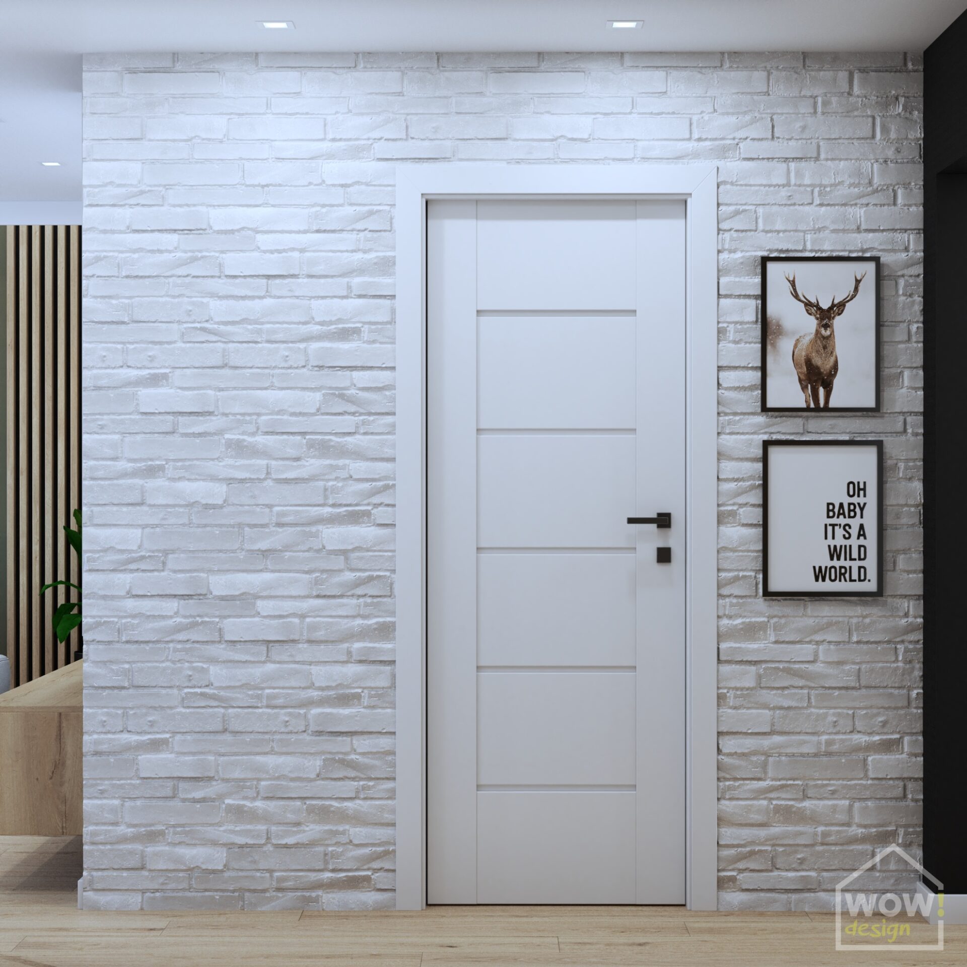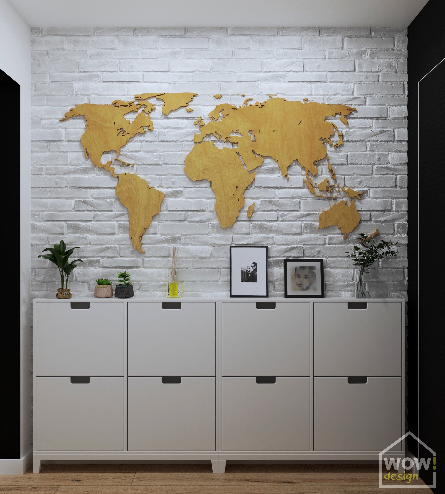 Hol, w którym znajdują się ściany z cegłą wprowadza w styl skandynawski królujący w pozostałych pomieszczeniach w mieszkaniu w Kielcach. Mimo małej przestrzeni udało się wygospodarować miejsce na zabudowę do przechowywania kurtek czy butów. W drugiej części holu pierwsze skrzypce gra drewniana mapa 3d, która nie tylko nadaje charakteru, ale i świetnie ociepla jasne ściany.